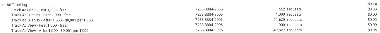 Exemplo: Na imagem, você pode observar que havia uma cota gratuita de 1.000 requisições por serviço, após a qual a cobrança se inicia. É notável que essa cota não foi atingida para o serviço de Rastreamento de Cliques, o que significa que não haverá cobranças por este serviço. Você também pode observar que, após atingir a cota, o serviço de Rastreamento de Exibição é cobrado a $0,001 por 1.000 requisições. Houve quase 93 mil requisições para este serviço, resultando em uma fatura de $0,09. Adicionalmente, depois que o Rastreamento de Visualização passou da marca de 1.000 requisições, ele cobrou por quase 48 mil requisições, resultando em uma fatura de $0,05, atingindo uma fatura total de Rastreamento de Anúncios de $0,14.