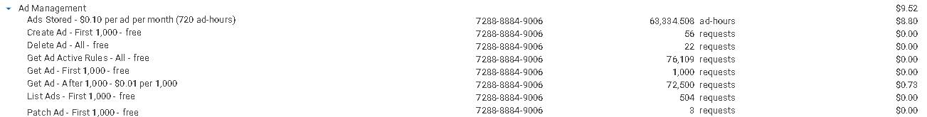 Exemplo: Na imagem, houve quase 63 mil horas de anúncio consumidas, o que equivale a manter quase 88 anúncios ativos por um mês (720 horas). Isso resulta em uma fatura de $8,80. Além disso, houve quase 73 mil requisições de anúncios; as primeiras mil foram gratuitas e, depois disso, as requisições foram faturadas a $0,01 por mil, resultando em uma fatura de $0,73. Portanto, a fatura total de Gerenciamento de Anúncios ($8,80 + $0,73) foi de $9,52.
