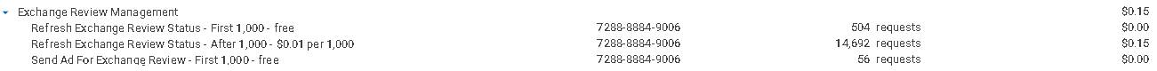 Exemplo: Nesta imagem, você notará que havia uma cota gratuita de 1.000 requisições para a atualização do status da revisão de exchange. Após exceder esta cota, o serviço foi faturado a $0,01 por 1.000 requisições. Com quase 15.000 requisições feitas, a fatura resultante é de $0,15. O outro serviço não excedeu a cota gratuita, então não haverá cobranças por ele.