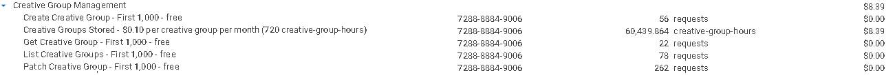 A subseção de Gerenciamento de Grupos de Criativos descreve os custos associados ao gerenciamento de grupos de criativos. Ações de exclusão não incorrem em cobranças. Cada serviço oferece uma cota gratuita de 1.000 requisições, exceto armazenamento. Uma vez que a cota gratuita é excedida, as cobranças se aplicam por requisição. Os custos de armazenamento são baseados no número de grupos de criativos armazenados na plataforma e na duração de seu armazenamento.