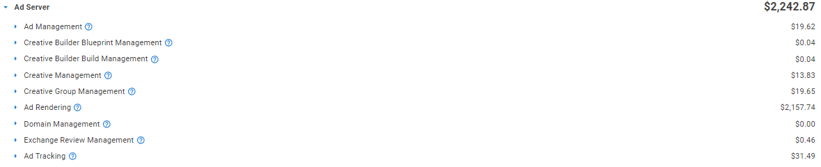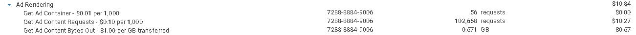 A subseção de renderização de anúncios detalha os custos associados ao serviço de renderização de anúncios. Uma renderização é contada cada vez que um anúncio é exibido em uma tela, seja para um usuário ou em uma pré-visualização durante o processo de criação. Você será cobrado por requisição ao recuperar um contêiner de anúncio ou conteúdo de anúncio. Além disso, os faturamentos pela renderização de um anúncio serão baseadas no número de bytes de conteúdo do anúncio transferidos durante o processo.