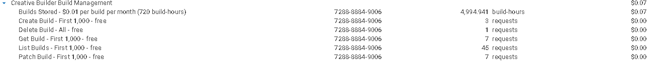 Exemplo: Você notará que nesta imagem, exceto pelo armazenamento, não houve cobranças, pois os serviços listados tinham uma cota gratuita de 1.000 requisições, que não foi excedida. O armazenamento foi cobrado a $0,01 por build por mês (720 horas). Quase 5.000 horas de build foram consumidas, o que equivale a manter quase 7 builds armazenados por um mês, resultando em uma fatura de $0,07.