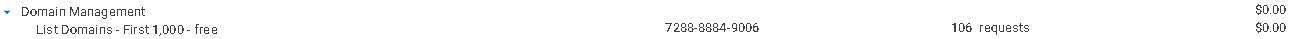 Esta subseção contém informações de faturamento relacionadas ao processo de gerenciamento de domínios. Há uma cota gratuita de 1.000 requisições para o serviço de listagem de domínios, após a qual as cobranças serão aplicadas por requisição.