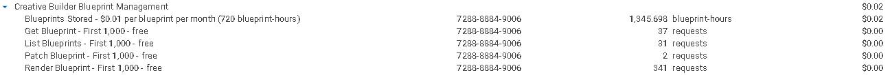 A subseção de Gerenciamento de Blueprints detalha os custos relacionados ao processo de gerenciamento de blueprints. O armazenamento dos blueprints é cobrado com base em quantos você tem e por quanto tempo eles foram armazenados. Há uma cota gratuita de 1.000 requisições disponível para os outros serviços nesta subseção, após a qual você será cobrado por requisição.