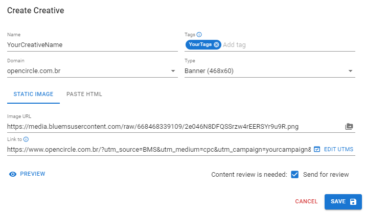 Exemplo - "SuaCampanha": Aqui você pode simplesmente indicar o nome da sua campanha para identificar melhor a campanha em que o criativo está sendo usado.