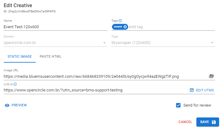 Se estiver pronto para enviar o criativo para revisão, certifique-se de que a opção "Enviar para revisão" esteja marcada. Se desejar continuar editando mais tarde, deixe-a desmarcada.