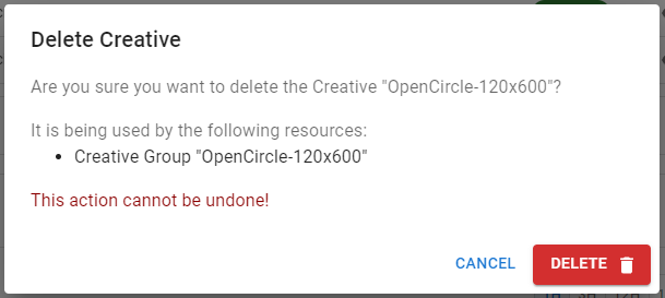 . Se o criativo estiver em uso, você verá uma lista dos grupos de criativos que serão afetados. Se você confirmar a exclusão, os grupos de criativos serão modificados para remover o criativo excluído da rotação.