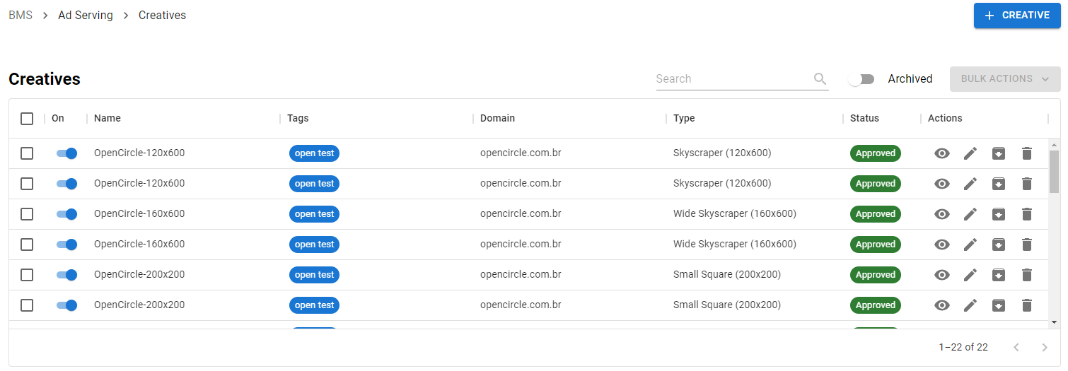 Criativos são a menor unidade de construção do nosso Ad Server, representando o que será entregue ao usuário final quando seu anúncio for exibido.