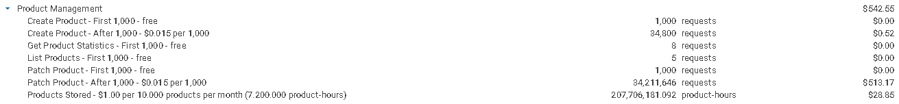 Esta subseção contém os detalhes de custo relacionados ao gerenciamento de produtos. Exclusões são gratuitas. Exceto pelo armazenamento, cada serviço nesta seção tem uma cota gratuita de 1.000 requisições, após a qual você será cobrado por requisição. O armazenamento é cobrado com base no número de produtos que você armazenou e na duração de seu armazenamento.