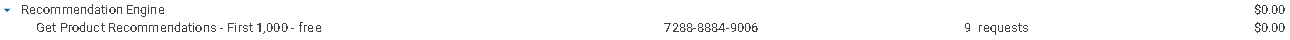 Exemplo: Nesta imagem, você notará que uma cota gratuita de 1.000 requisições foi dada a cada serviço. Após exceder esta cota, as cobranças foram aplicadas com base no número de requisições usadas. Houve quase 151 mil requisições para rastreamento de eventos de produto, resultando em uma fatura de $1,51, e quase 31 mil requisições de rastreamento de eventos de recomendação, resultando em uma fatura de $0,31, totalizando $1,82 pelos serviços na seção.