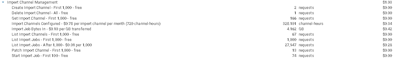Exemplo: Nesta imagem, você notará que para a maioria dos serviços a cota gratuita não foi excedida e, portanto, nenhuma cobrança foi aplicada. Também é possível observar que quase 325 horas-canal foram consumidas, o que equivale a ter 1 canal de importação configurado por quase duas semanas, resultando em uma cobrança de $0,34. Você pode ver que quase 5 GB foram transferidos neste período, resultando em uma fatura de $0,42. Após atingir a cota, o serviço de listagem de tarefas de importação foi cobrado por requisição, resultando em uma cobrança de $0,28. Portanto, este cliente será cobrado em $1,03 pelos serviços nesta subseção.