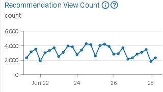 Exemplo: No contexto em que você tem uma campanha que está usando um modelo de recomendação para gerar banners, esta métrica mostrará uma contagem de visualizações em suas recomendações. Os dados que esta métrica fornece são úteis para entender se suas recomendações estão sendo visualizadas. Além disso, comparar esta métrica com a métrica de Contagem de Recomendações Clicadas permitirá que você entenda se seu banner é interessante para seus públicos-alvo. Neste gráfico, o período definido foi de 1 semana, dividido em períodos de 6 horas. Você notará que em 26 de junho, às 12h, houve quase 4.000 visualizações em suas recomendações.