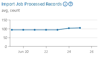 Exemplo: Você pode usar esta métrica para medir quantos registros estão sendo processados durante suas tarefas de importação. Neste gráfico, o período definido foi de 1 semana, dividido em períodos diários. Você notará que nos primeiros 5 dias, a tarefa de importação estava processando quase 100 registros; nos últimos 2 dias, estava processando um pouco mais de 100 registros, o que significa que o arquivo de feed foi modificado.