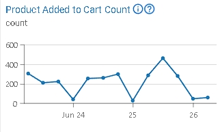 Exemplo: Em um contexto onde você instala um evento em seu site com a intenção de rastrear produtos que foram adicionados ao carrinho por seus usuários e também configura uma ação para rastrear o produto no catálogo quando este evento acontece, esta métrica mostra quantas vezes um produto foi adicionado ao carrinho. Use esses dados para entender em quais produtos o público do seu site está mais interessado. O período definido para este gráfico foi de 3 dias, dividido em períodos de 6 horas, representados como pontos. Você notará que em 24 de junho, entre 12h e 18h, quase 400 produtos foram adicionados ao carrinho.