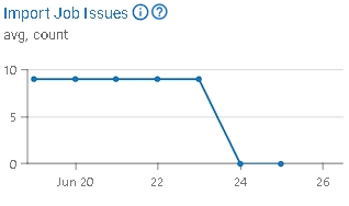 Exemplo: Quando uma tarefa de importação foi concluída, no entanto, alguns problemas ocorreram no processo, como um problema de mapeamento ou dados ausentes no arquivo de feed. Neste gráfico, o período definido é de 1 semana, dividido em períodos diários. Você notará que durante os primeiros 5 dias da semana, houve quase 10 problemas com as tarefas de importação. Além disso, você observará que a partir de 24 de junho, não houve problemas, indicando que o arquivo de feed foi corrigido.