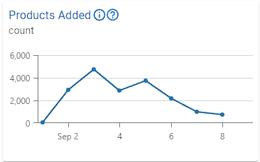 Exemplo: Você pode adicionar seus novos produtos ao catálogo sempre que precisar. Esta métrica o ajudará a entender quantos novos produtos foram adicionados. Nesta imagem, o período definido foi de 8 dias, dividido em períodos diários. Em 2 de setembro, quase 3 mil produtos foram adicionados ao catálogo. Você também pode observar que, todos os dias, novos produtos foram adicionados.