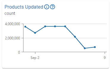Exemplo: Ao atualizar o catálogo, esta métrica o ajudará a rastrear o número de produtos que foram atualizados. Use esses dados para garantir que todas as atualizações feitas em seu arquivo de feed foram processadas pela plataforma. Nesta imagem, o período definido foi de 8 dias, dividido em períodos diários. Você notará que em 2 de setembro, quase 3 milhões de produtos foram atualizados; depois, entre 3 e 5 de setembro, quase 4 milhões de produtos foram atualizados diariamente. Após isso, podemos observar um número decrescente de atualizações de produtos.