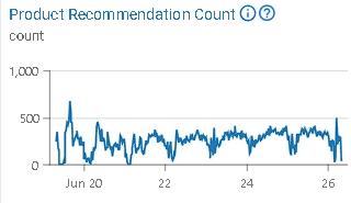 Exemplo: No contexto de usar um modelo de recomendação para uma campanha de retargeting, esta métrica mostrará quantas vezes um produto foi incluído em uma recomendação. Use esses dados para entender quais de seus produtos estão sendo recomendados em seus banners. Neste gráfico, o período definido foi de 1 semana, dividido em períodos de 30 minutos. Você também notará que a contagem de recomendações de produto foi de quase 500 na maior parte do tempo.