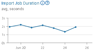 Exemplo: Use os dados obtidos nesta métrica para definir a melhor opção de atualização de catálogo de acordo com as necessidades do seu negócio. Neste gráfico, o período definido foi de 1 semana, dividido em períodos diários. Você notará que em 24 de junho, o tempo até a conclusão da tarefa de importação foi de quase 1 segundo.