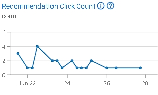 Exemplo: Caso você tenha uma campanha usando um modelo de recomendação, esta métrica mostrará uma contagem de recomendações clicadas. Esses dados o ajudarão a medir a eficiência do seu modelo de recomendação, o que permitirá testar diferentes estratégias de marketing e observar como seu público está reagindo. Neste gráfico, o período definido foi de 1 semana, dividido em períodos de 6 horas. Você notará que em 22 de junho, às 12h, houve 4 cliques nos produtos recomendados.