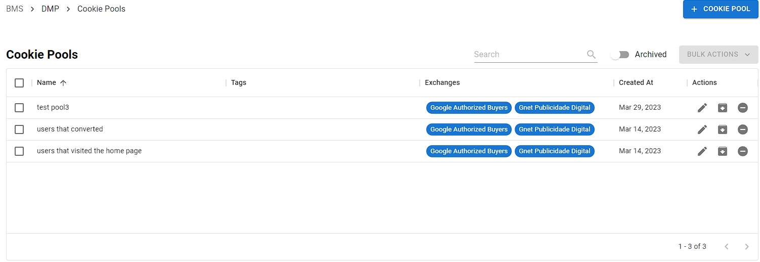 para arquivar o pool de cookies selecionado. Visualize seus pools de cookies arquivados ativando a chave seletora "Arquivados" acima da lista de pools de cookies. Também é possível desarquivar um pool de cookies clicando em