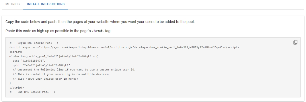 Após criar um cookie pool, você precisará instalá-lo em seu site para começar a usá-lo. Isso pode ser feito seguindo as instruções na aba Instruções de Instalação da página de cookie pools.