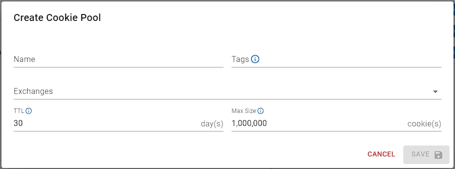 Um cookie pool deve ser criado pouco antes de ser usado para uma campanha, para que possa ser populado. Configure por quanto tempo seus cookies devem ficar disponíveis antes de expirarem, defina quantos cookies você deseja armazenar em seu pool e selecione as Ad Exchanges que você usará para sincronizar seus cookies com ele.