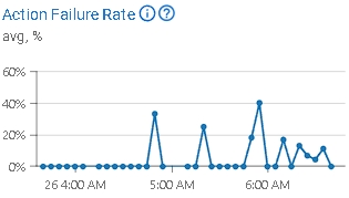 Exemplo: Quando um usuário adiciona um produto ao carrinho em seu site e este evento está configurado para ser rastreado, com uma ação para rastreá-lo no catálogo, o evento em si é rastreado com sucesso. No entanto, a ação para atualizar o catálogo falhou, resultando no não rastreamento do produto. No gráfico, você pode observar que a taxa de falha de ação é tipicamente de 0%. No entanto, há momentos em que a taxa de falha de ação atinge picos próximos a 40%. O gráfico cobre um período de 3 horas, dividido em intervalos de 5 minutos.