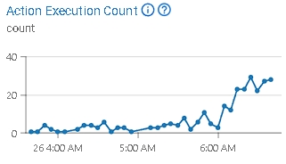Exemplo: Neste gráfico, você pode observar um aumento no número de ações às 6h da manhã. O gráfico exibe um período de 3 horas, dividido em intervalos de 5 minutos, representados como pontos de dados. Após criar um rastreador, você precisará configurar eventos e ações. Cada vez que um evento rastreado ocorre, as ações configuradas associadas a esse evento também serão executadas. Por exemplo, um evento de 'adicionar ao carrinho' pode acionar uma ação para rastrear o produto adicionado no catálogo. Esta métrica indica quando e com que frequência a ação é executada dentro desse período.