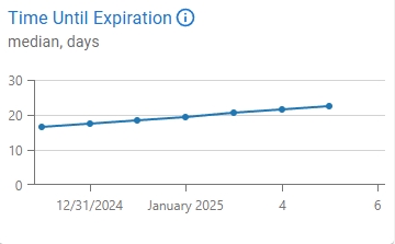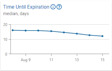 Exemplo: Ao criar seu identifier pool, você pode definir o número de dias em que um identificador adicionado ao pool expirará. Esta métrica mostra a mediana do tempo que você tem até a expiração de um identificador. Neste gráfico, o período definido foi de 1 semana, dividido em períodos diários. Você notará que em 30 de dezembro a mediana era de cerca de 16 dias até a expiração dos identificadores, e nos dias seguintes essa mediana continuou aumentando até 5 de janeiro, quando era de cerca de 23 dias até a expiração.