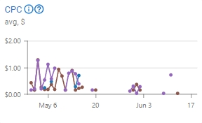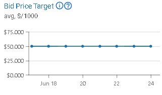 Exemplo: Neste gráfico, você pode observar que o preço médio do lance para esta campanha foi de $50 por lance para o período de tempo definido (17-24 de junho). Se você definir um preço de lance variável entre $0,0001 e $100, observará que esta métrica mostrará o preço do lance alvo; na visualização máxima, o cartão mostrará o valor máximo do lance, na mínima, mostrará o valor mínimo, e na média, o valor médio configurado para sua campanha.