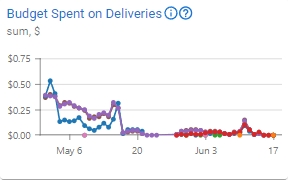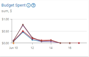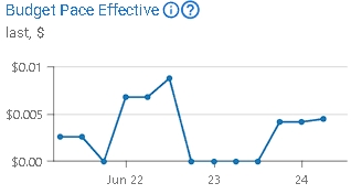 Exemplo: Se você tem um budget diário de $10, esta métrica mostrará o ritmo em que este budget deve ser gasto ao longo de sua campanha. Neste gráfico, você pode observar que o budget diário estava abaixo de $5 de 16 a 23 de junho, e em 24 de junho, o budget diário aumentou para $15.