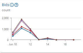 Exemplo: O gráfico mostra o volume de lances em uma campanha ao longo de seis dias (10-16 de junho). O número de lances varia consideravelmente, com o pico em 11 de junho (2.000 lances) e o número mais baixo em 14 de junho (menos de 500 lances). Em 16 de junho, o lance mais alto e o mais baixo são iguais. Você pode ver por essas métricas que nem todos os lances foram bem-sucedidos. Ao fazer mudanças estratégicas com base no preço do lance e nas segmentações, você pode alcançar uma taxa de vitória mais alta. Pode ser que o público que você estava segmentando seja mais caro do que o lance definido.