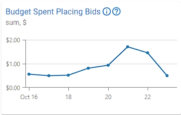 Exemplo: Quando você começa a executar uma campanha em nossa plataforma, o sistema começará a fazer lances de acordo com as configurações de sua campanha. Esta métrica mostra uma soma de quanto do seu budget foi consumido na realização de lances. Nesta imagem, você notará que o período definido foi de 1 semana, dividido em períodos diários; de 16 a 18 de outubro, o consumo relacionado à realização de lances foi de quase $0,50 por dia. Depois disso, você observará um aumento desse valor até quase $2,00 em 21 de outubro, e depois ele diminui novamente.