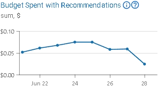 Exemplo: Em um contexto onde você tem uma campanha de retargeting projetada para engajar usuários em seu site, o budget alocado para recomendar produtos de seu catálogo a esses usuários é mostrado na métrica "Budget gasto com recomendações". O gráfico exibe um período de uma semana, com cada ponto correspondendo a um dia e ao budget gasto com recomendações. Você pode ver que em 24 de junho, o budget gasto com recomendações foi de quase $0,07, com uma queda considerável em 28 de junho.