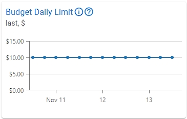 Exemplo: Use os dados fornecidos nesta métrica para entender o limite de budget diário configurado no momento. Nesta imagem, o período definido foi de 3 dias, dividido em períodos de 6 horas. Você notará que o limite de budget diário configurado era de $10,00, e essa configuração permaneceu inalterada.