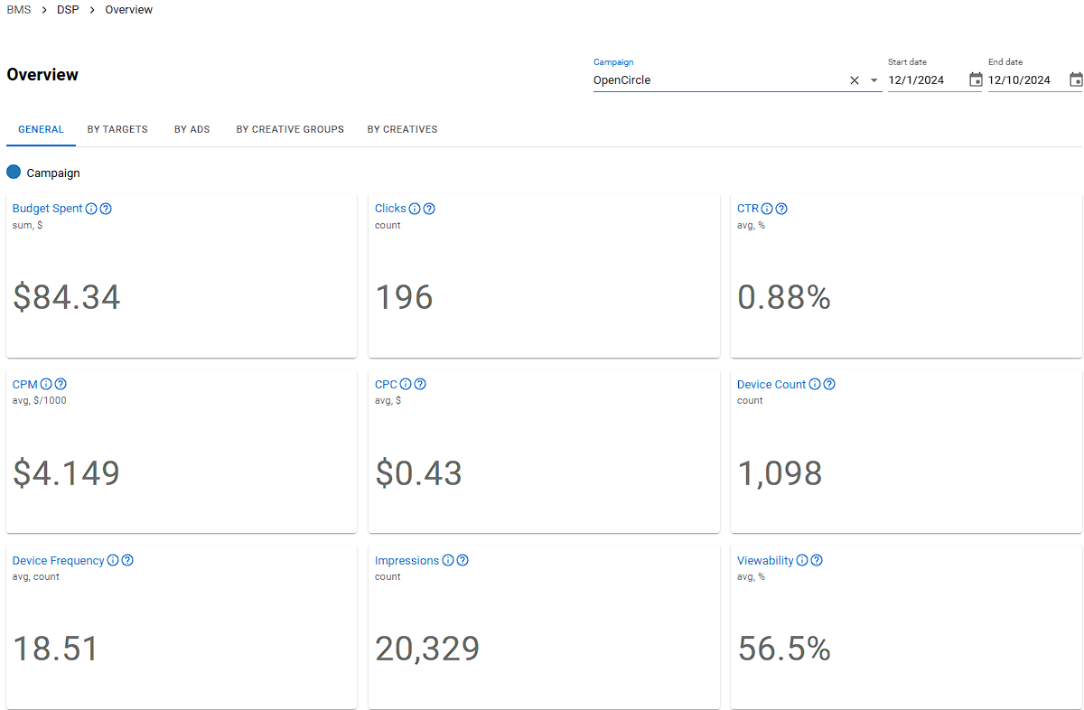 Após selecionar uma campanha e um período, você verá uma visão geral dessa campanha, incluindo todas os públicos-alvo, anúncios, grupos de criativos e criativos que estão impactando a campanha, e como eles estão performando.