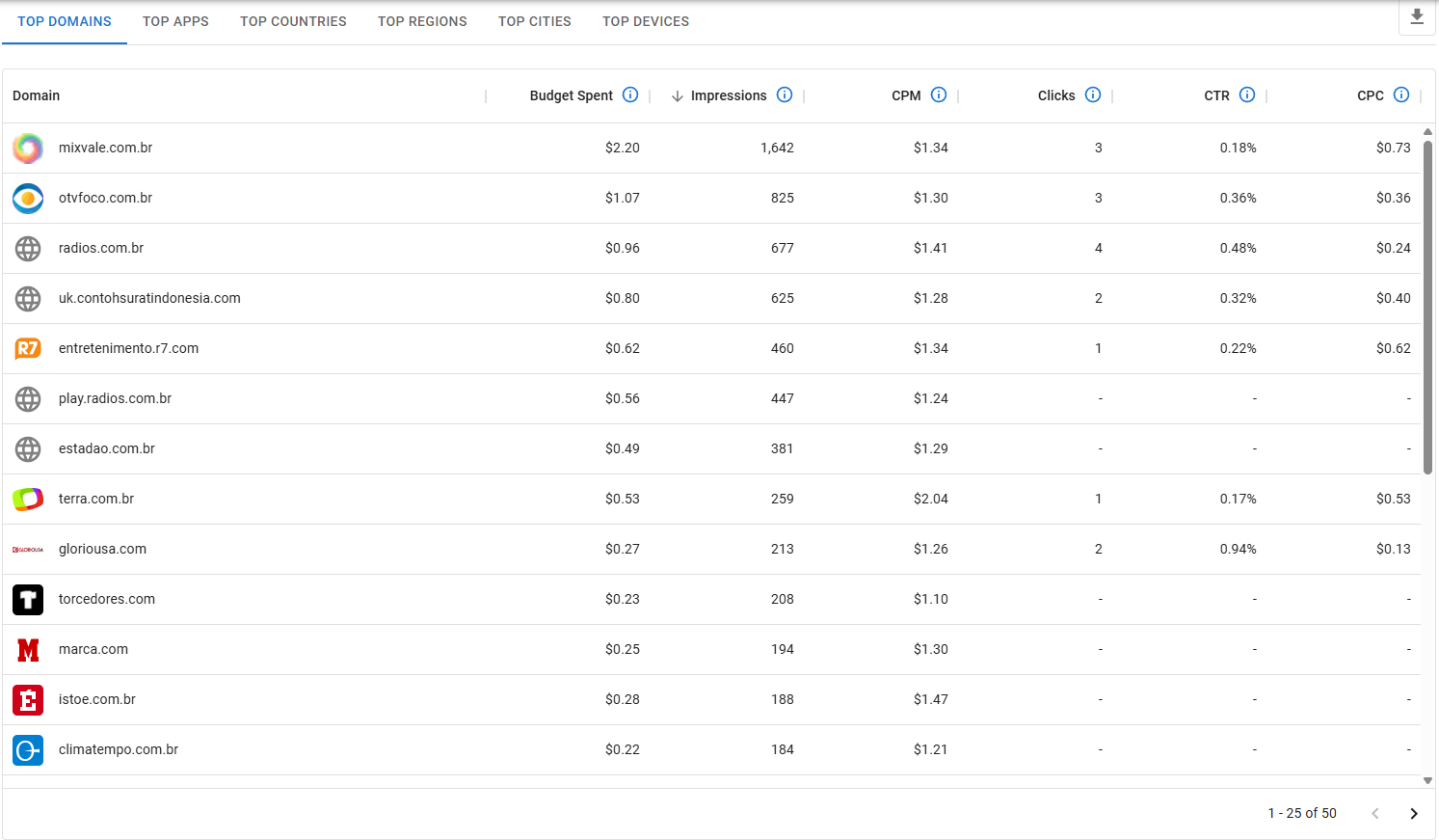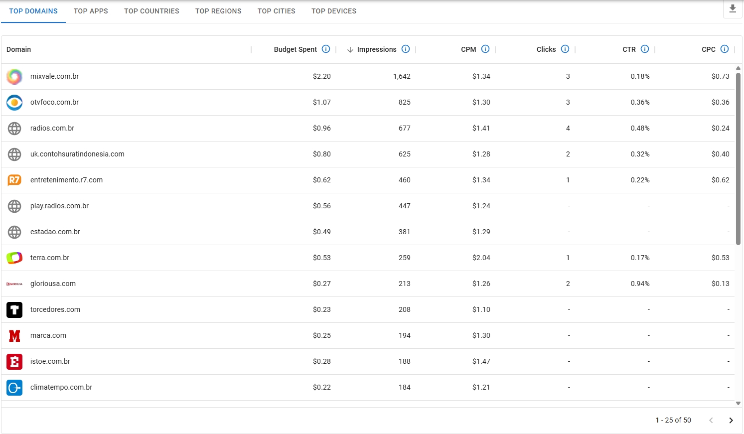Também é possível verificar os principais domínios, aplicativos, países, regiões, cidades e dispositivos para cada campanha através da aba Visão Geral. Ela apresenta as métricas mais relevantes e mostra o desempenho de cada um, fornecendo dados valiosos para que você tome decisões estratégicas.