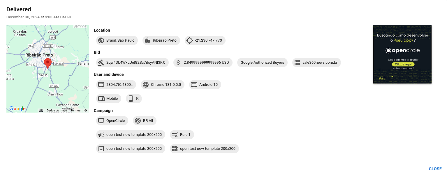 Aqui você pode observar todos os detalhes de um evento específico, como a geolocalização do usuário, IP, navegador e tipo de dispositivo. Os parâmetros para o lance (bid), ad exchange e domínio, e aqueles relacionados à campanha, público-alvo, anúncio, regra do anúncio, grupo de criativos e criativo específicos, juntamente com uma pré-visualização do próprio criativo.