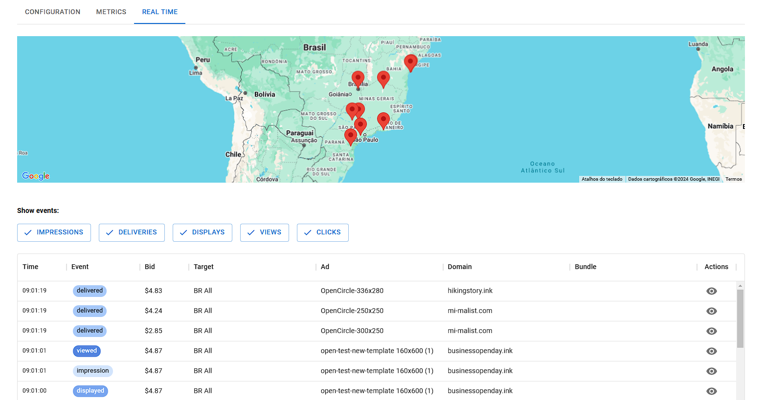 Os recursos de Anúncio e Campanha possuem uma aba dedicada de monitoramento em tempo real que permite ao cliente ver o que está sendo entregue em tempo real.