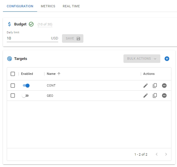 Taxa de Cliques (CTR) - Ajuste o controle deslizante para definir o limite mínimo de Taxa de Cliques para os espaços de anúncio. Seus anúncios serão combinados apenas com inventários onde o CTR é maior que o limite selecionado. A informação usada para este recurso é o banco de dados da BMS, de acordo com todas as campanhas em execução que coletam dados. Este recurso funciona para os inventários de todas as exchanges.