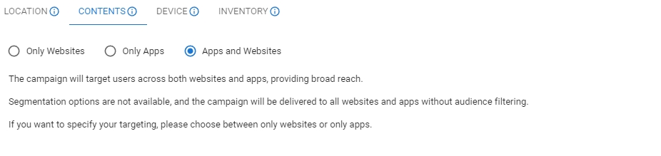 Ao selecionar esta opção de segmentação, sua segmentação de conteúdo entregará seus anúncios a usuários tanto em sites quanto em aplicativos. Nenhuma outra opção de segmentação está disponível nesta aba quando esta opção é selecionada.