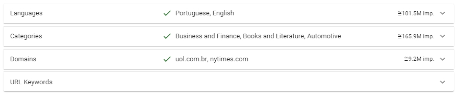Exemplo: Na imagem acima, você notará que Inglês e Português foram selecionados como idiomas para esta segmentação, e suas impressões estimadas foram somadas quando o grupo foi fechado, resultando em uma estimativa total de 101,5M de impressões para ambos os idiomas combinados. Categorias e Domínios também foram selecionados. Em Categorias, você verá que várias categorias foram selecionadas, resultando em 165,9M de impressões quando combinadas. Para Domínios, cada domínio que você inclui se soma ao total de impressões. Neste caso, apenas dois domínios foram selecionados, resultando em uma média de 9,2M de impressões.