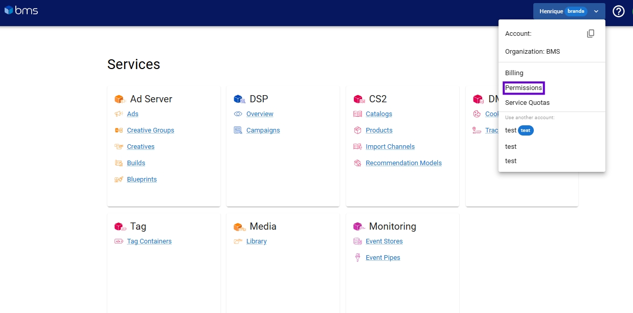 A página de IAM é acessível clicando em Permissões no menu da conta.