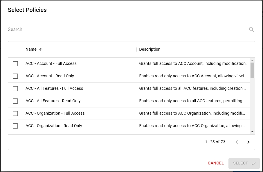 Seletor de Políticas Exemplo 1: A política "ACC - Account - Full Access" concederá ao usuário acesso total ao recurso de conta, o que significa que o usuário pode editar qualquer informação relacionada à página de contas. Exemplo 2: A política "BMS - All Features - Read Only" concederá ao usuário apenas privilégios de leitura para todos os recursos da BMS.