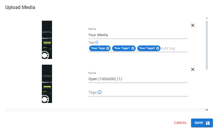 Após selecionar todas as mídias que deseja carregar, você tem a opção de renomeá-las e definir tags para identificar melhor suas mídias.