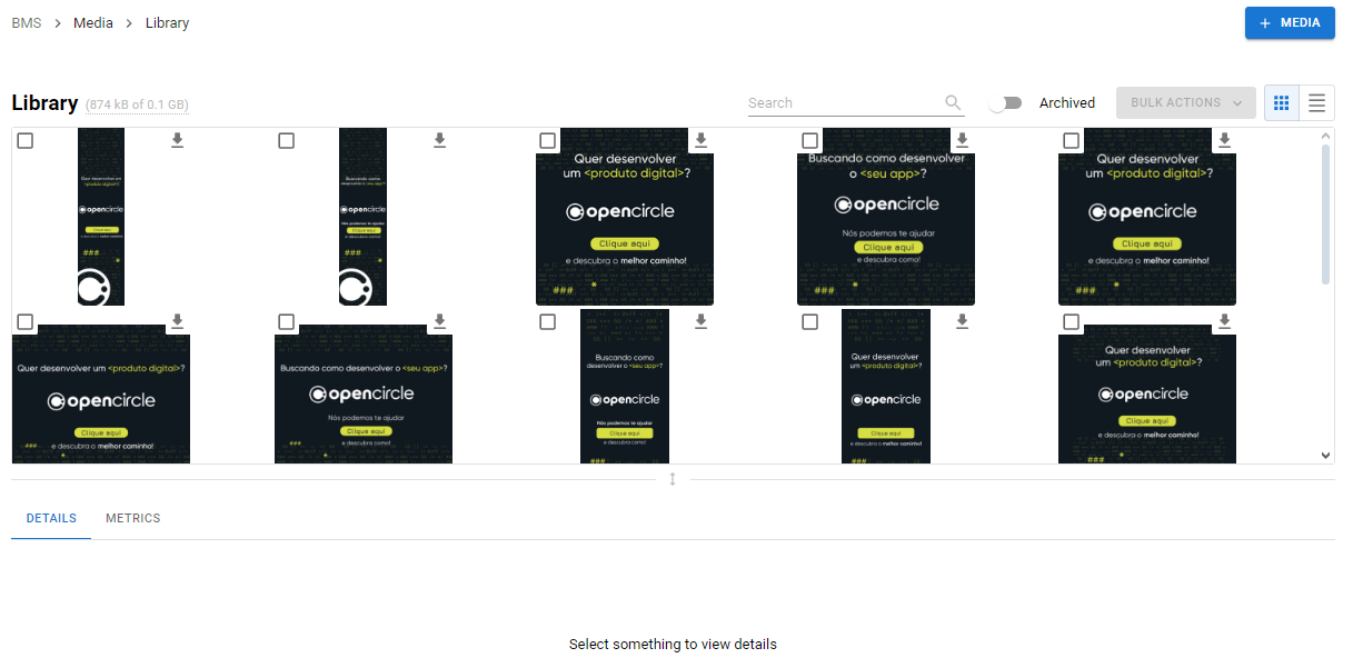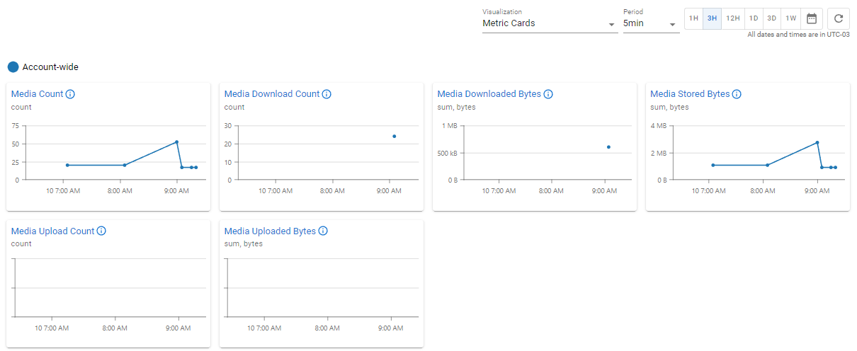 Fornecemos uma breve métrica para cada mídia, informando quantas vezes a mídia foi baixada e quantos bytes foram usados.