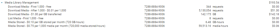 Exemplo: Nesta fatura, nota-se que a mídia foi baixada 5.130.054 vezes, resultando em uma cobrança de $51,30. O total de dados transferidos de todas essas requisições totalizou 142,175 GB, levando a uma cobrança adicional de $142,18. Os custos de armazenamento de mídia foram mínimos, de $0,06, devido a um pequeno número de arquivos de mídia na biblioteca e a uma curta duração de armazenamento. Após somar todas as cobranças, o valor total é de $193,54.