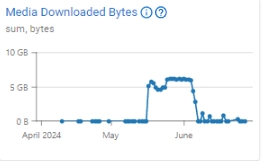Exemplo: Esta métrica mostra um aumento na quantidade de mídias na biblioteca em algum momento de maio. Posteriormente, algumas dessas mídias foram removidas por não estarem mais em uso. Atingiu-se um pico de 2.000 arquivos de mídia, terminando com quase 500. É importante notar que a BMS cobra por arquivo de mídia e pelo tamanho da mídia armazenada na plataforma, portanto, realizar uma limpeza de tempos em tempos pode ser útil.