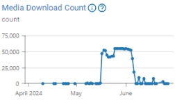 Exemplo: Se o seu criativo foi criado usando mídias da Biblioteca da BMS, nossa plataforma pode identificar que a mídia foi baixada no navegador do usuário final após vencer o leilão. Então, a métrica é preenchida, informando o desempenho da mídia. Neste gráfico, você pode ver que foi atingido um pico de quase 55.000 downloads.